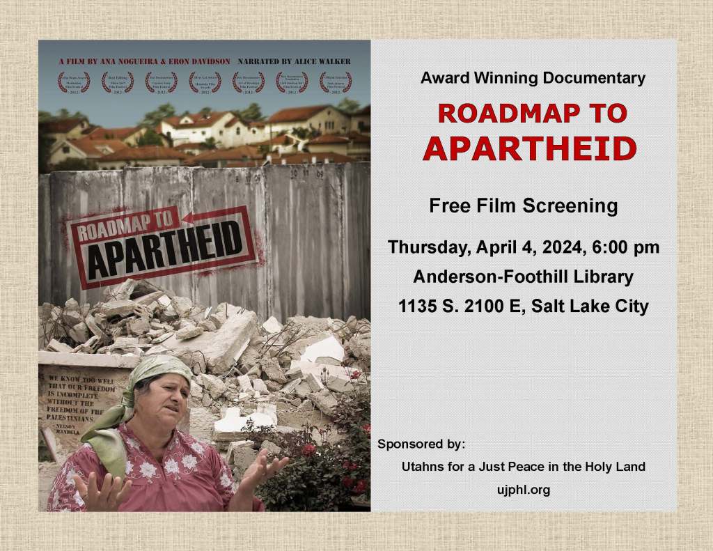 “With a comparison between apartheid South Africa and the Israel/Palestine conflict, this documentary traces the future of one conflict from the past of another. Weaving the history of apartheid into the complex issues facing Israelis and Palestinians, it highlights the frighteningly similar laws and tools used by Israel and apartheid-era South Africa. It’s a dark picture of the present but offers hope based on the peace that South Africa eventually found.”