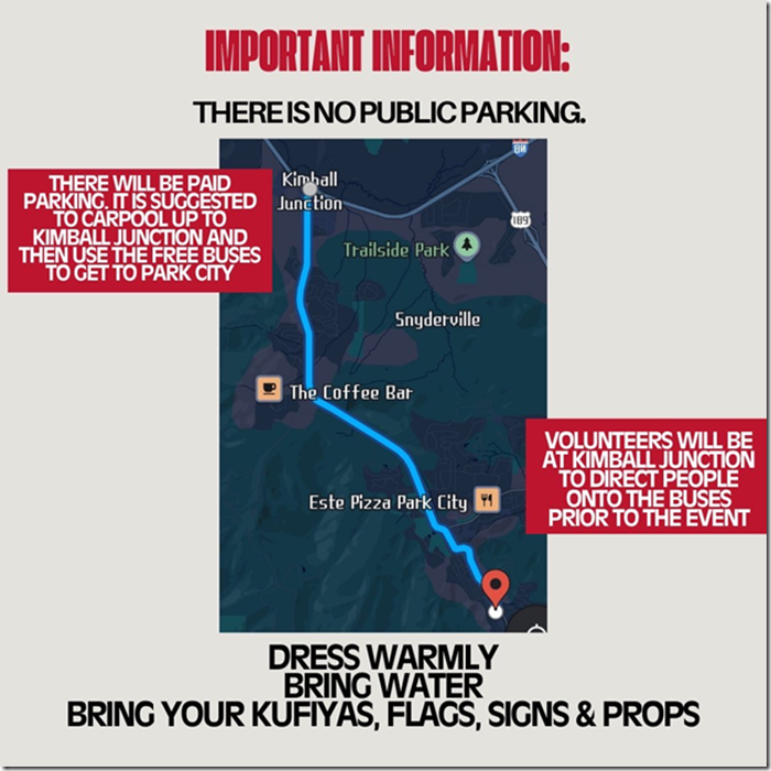 There is not an exact location other than uptown Park City—Main Street will be blocked to vehicles, so everyone will be on foot. Look for signs, flags, kufiyas, and a rolled out red carpet. Also rhere will be volunteers at the Kimball Junction parking to help you