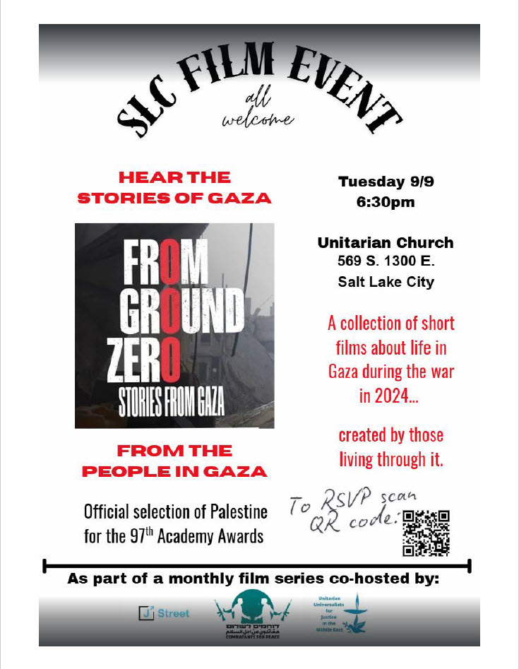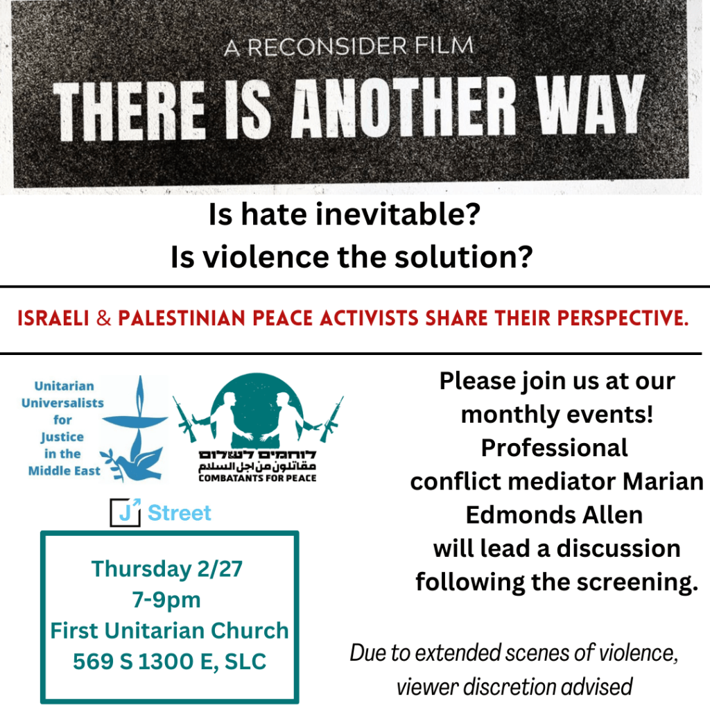 Please Join us! UUJME, J Street, Combatants for Peace, Utahns for a Just Peace & Bereaved Families group will be jointly presenting a film, “Joint Memorial Day Celebration” at the Unitarian church, Dec. 5th at 7:00 pm, 569 S 1300 East. A link to the film is provided below. There will be a time for questions and discussion following the film.