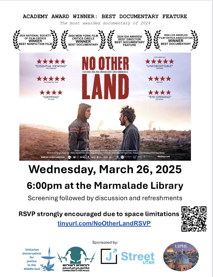 Utahns for a Just Peace in the Holy Land (“UJPHL”) invites you to a free public screening of the 2023 documentary film “Israelism” at the First Unitarian Church of Salt Lake City (569 South 1300 East) this coming Thursday, May 15, 2025 at 7:00 p.m. (Free parking is available in the Friendship Manor lot at 500 South and 1300 East. https://www.israelismfilm.com/info